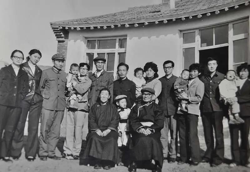 (“草原母亲”张凤仙夫妇和她收养的6个孩子及家人的全家福)