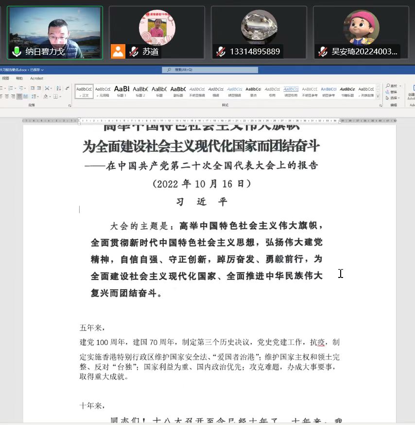 2022年11月1日上午,为了认真学习党的第二十次全国代表大会精神,全面、准确、完整领会习近平新时代中国特色社会主义思想,内蒙古师范大学铸牢中华民族共同体意识研究基地组织大家在线上研读党的二十大报告。基地首席专家纳日碧力戈教授主持研读会,基地副主任、院长乌日陶克套胡教授和部分教师以及硕士、博士研究生共20余人参加。