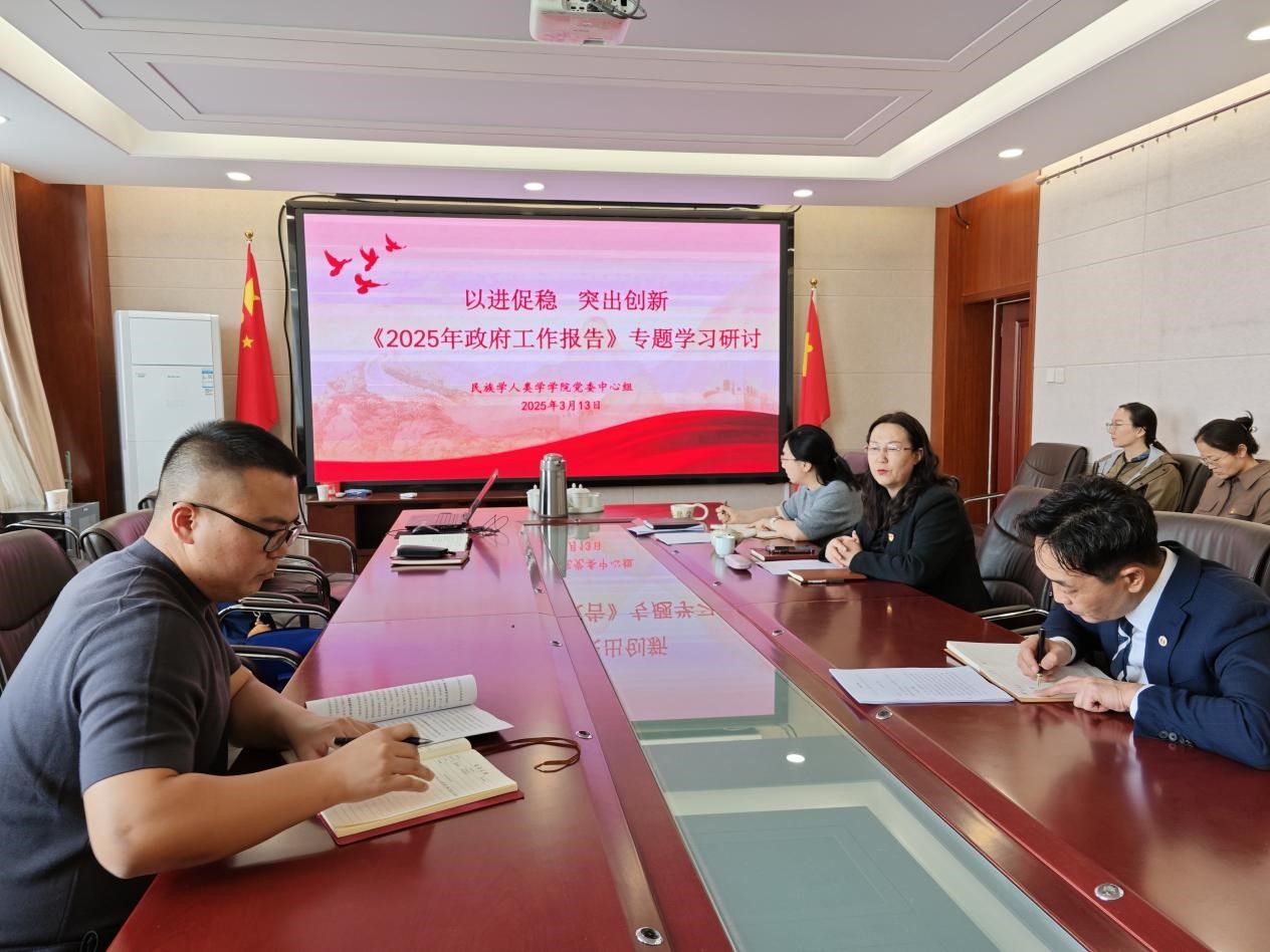 党委中心组在田楼607会议室召开专题学习研讨会,集中学习研讨了《2025年国务院政府工作报告》的主要内容。会议由学院党委书记包凤兰主持,学院党委中心组成员参加。