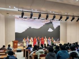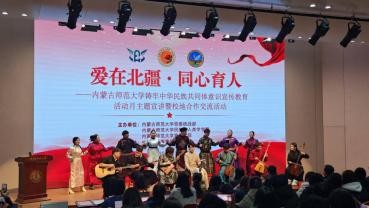 宣讲会中也穿插了精彩的节目,宣讲团成员展示了《骑兵荣耀代代传》、《我也是草原的孩子》等合唱,内蒙古师范大学音乐学院师生也献上了《牧人》等民歌联唱。故事与歌声交织,历史与现实对话,生动呈现了北疆大地各族人民手足相亲、守望相助的动人图景。
