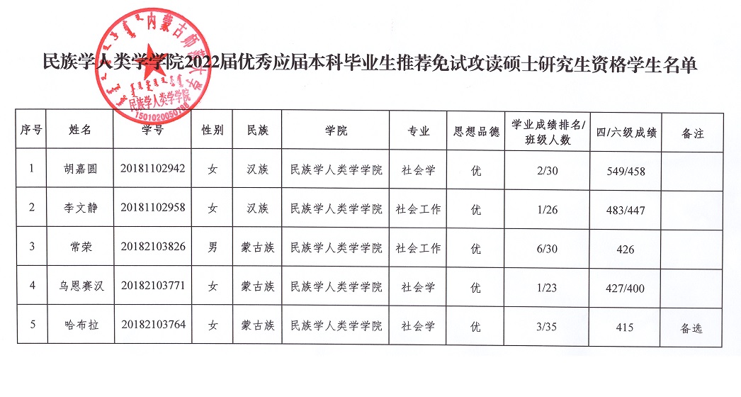 2022届优秀应届本科毕业生推荐免试攻读硕士研究生资格学生名单
