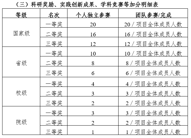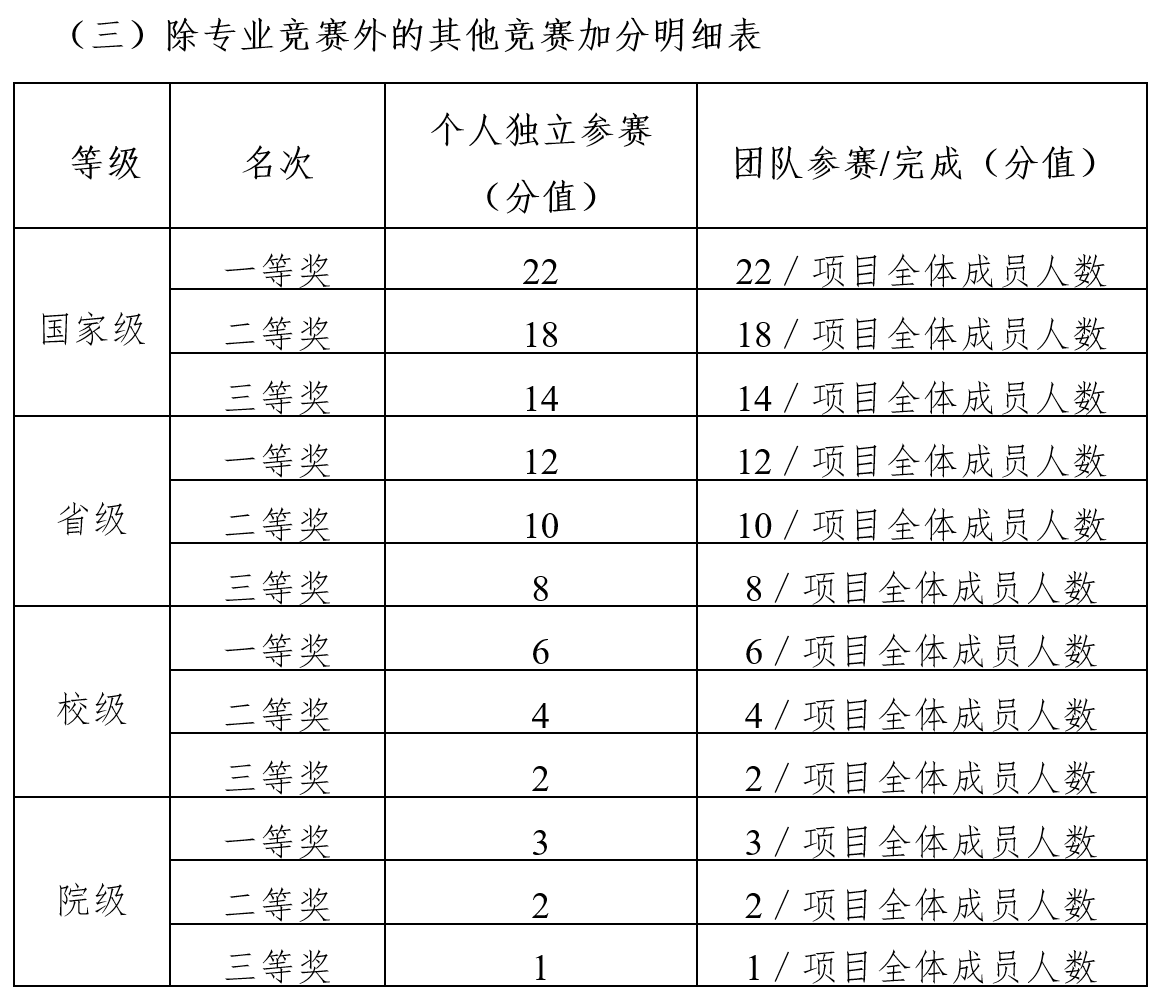 2.获得优秀奖、鼓励奖或参加省级以上比赛未取得名次者,按照下一个等级奖项的三等奖加分。如获得国家级优秀奖的,按照省级三等奖加分,以此类推。