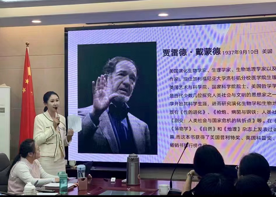首先,主讲人郝敏敏同学向大家介绍了这本关于“人类社会的命运”的著作,从作者生平、写作背景、内容介绍三个方面给大家展开讲解。作者贾雷德·戴蒙德是美国演化生物学家、生理学家、生物地理学家以及非小说类作家。现任加利福尼亚大学洛杉矶分校医学院生理学教授,美国艺术与科学院、国家科学院院士、美国哲学学会会员,是当代少数几位探究人类社会与文明的思想家之一。作者以生理学开始其科学生涯,进而研究演化生物学和生物地理学。著有《性的进化》、《枪炮、病菌与钢铁:人类社会的命运》《剧变:人类社会与国家危机的转折点》等。