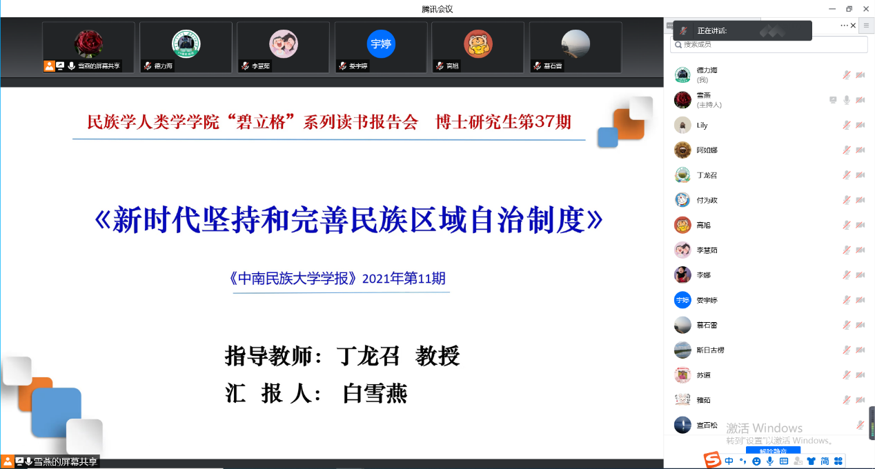 2020级、2021级博士研究生通过“腾讯会议”举行了第37期读书报告会。本次读书报告会的汇报者是2020级马克思主义民族理论与政策专业李慧茹、2021级马克思主义民族理论与政策专业白雪燕两位博士生。博士生导师丁龙召教授出席本次读书报告会并进行指导。