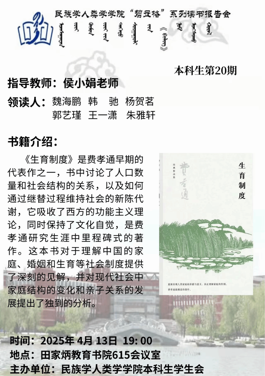 秉持笃学致知以夯基础、开卷启思以拓思路、读书明智以塑品格的理念,致力于营造积极向上、勤勉求知的学风。4月13日下午,本科生第20期“碧立格”系列读书报告会在田家炳教育书院615会议室成功举行。本期读书会由侯小娟老师指导,6位同学领读,阅读书目是《生育制度》。